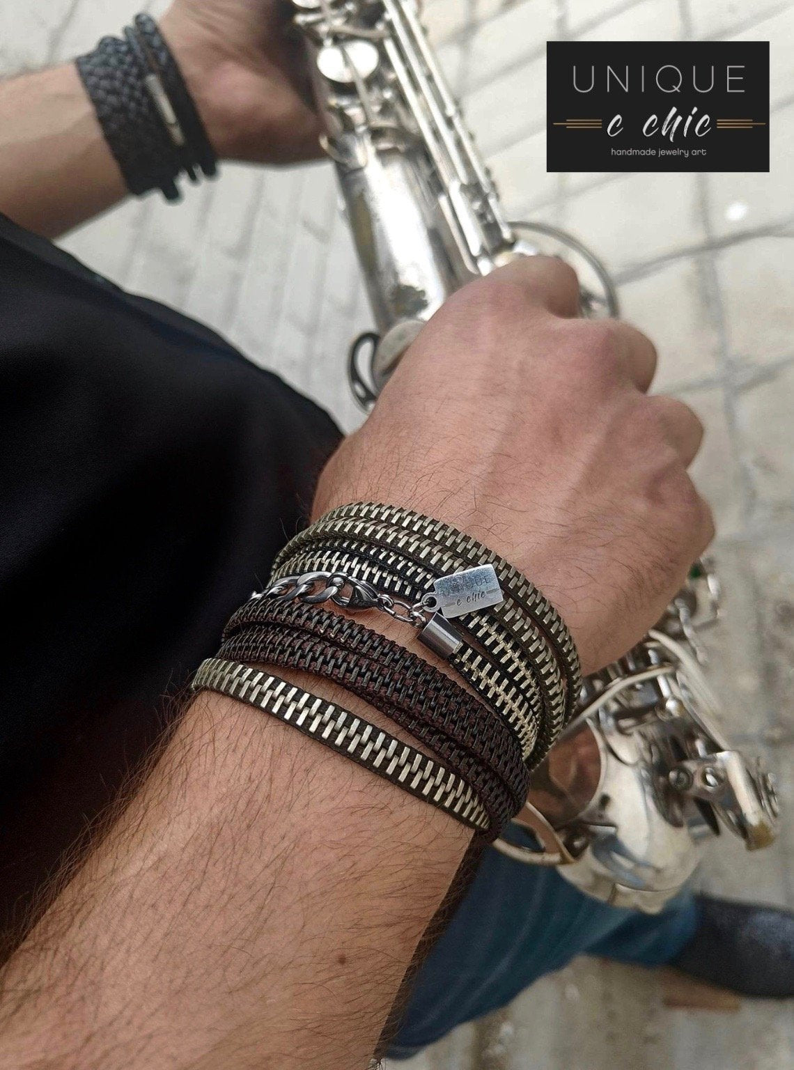 One-of-a-kind bracelet handmade from reclaimed zippers and industrial materials.