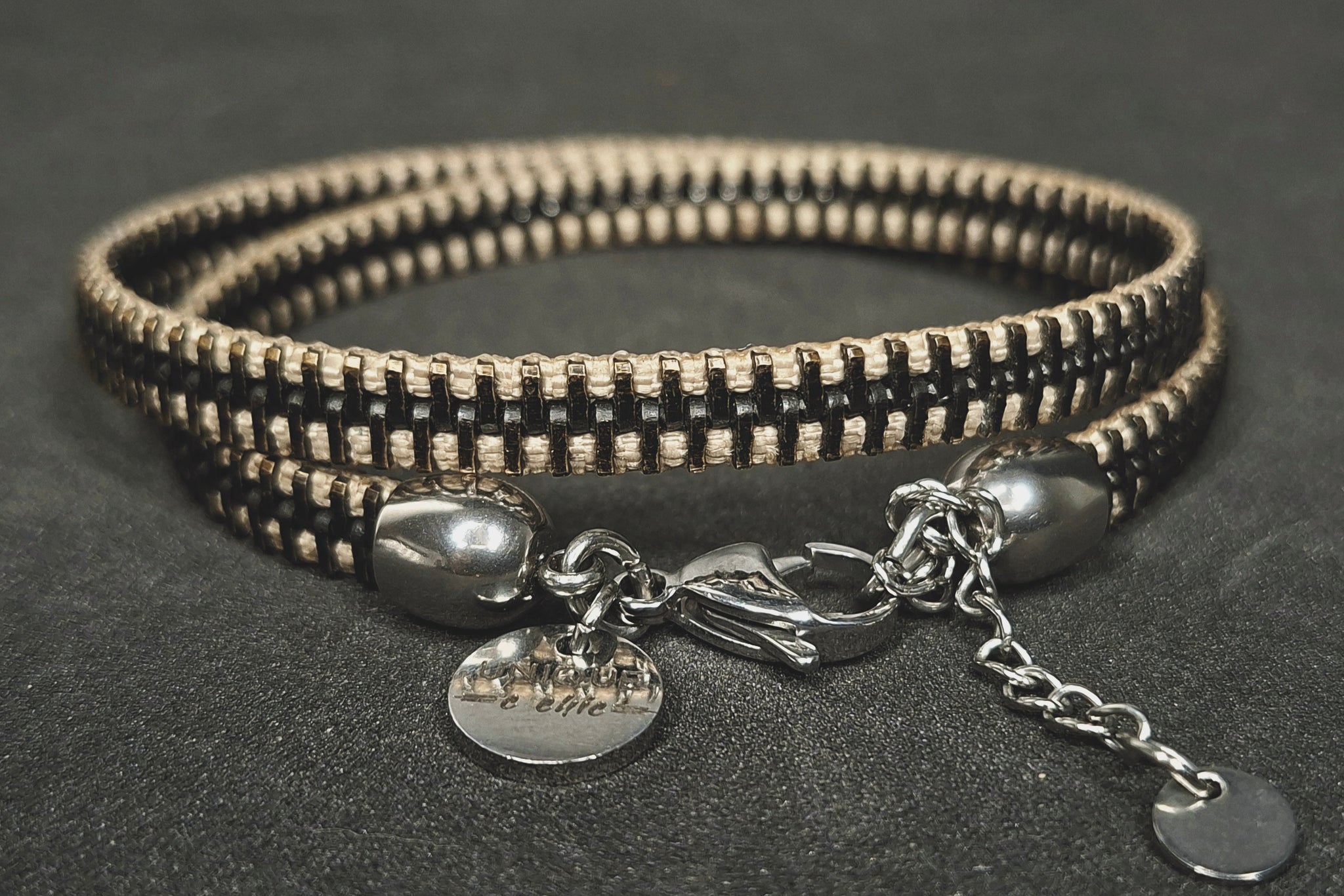 One-of-a-kind bracelet handmade from reclaimed zippers and industrial materials.
