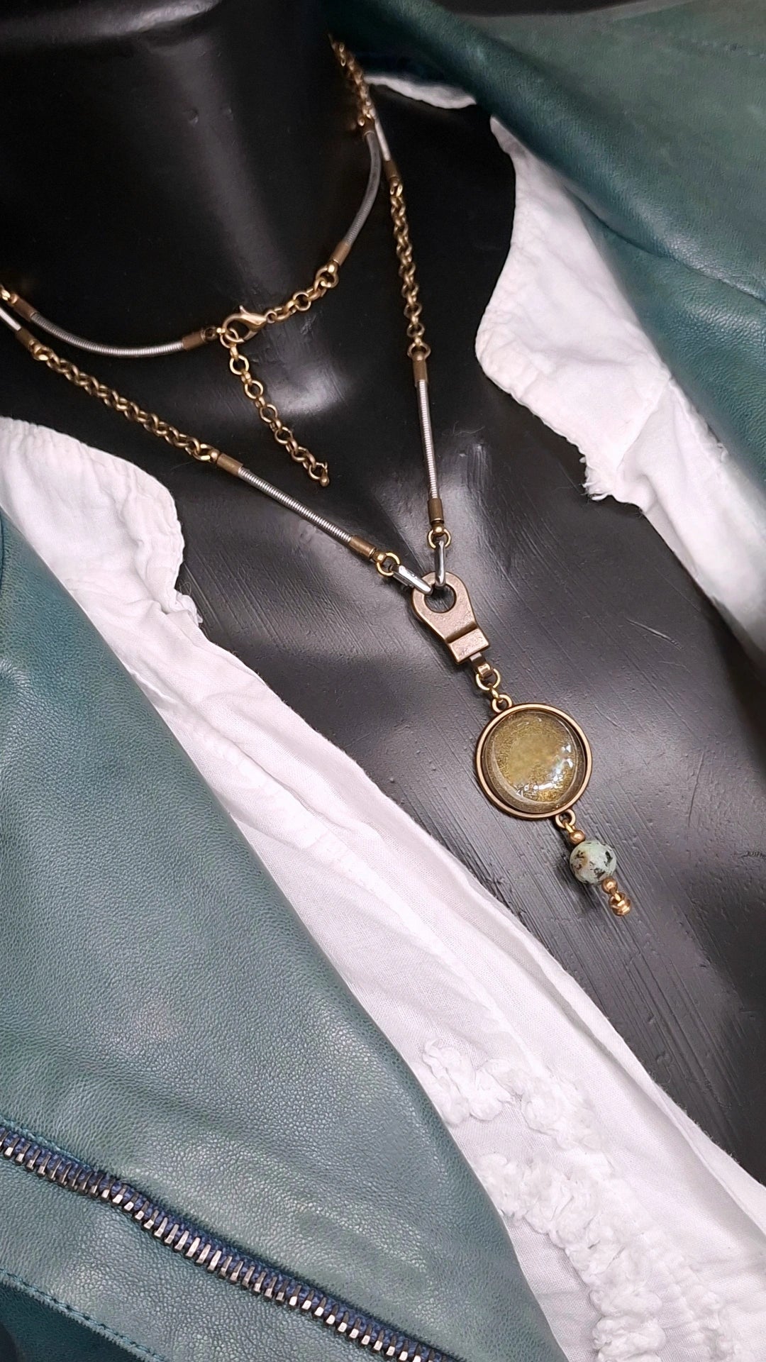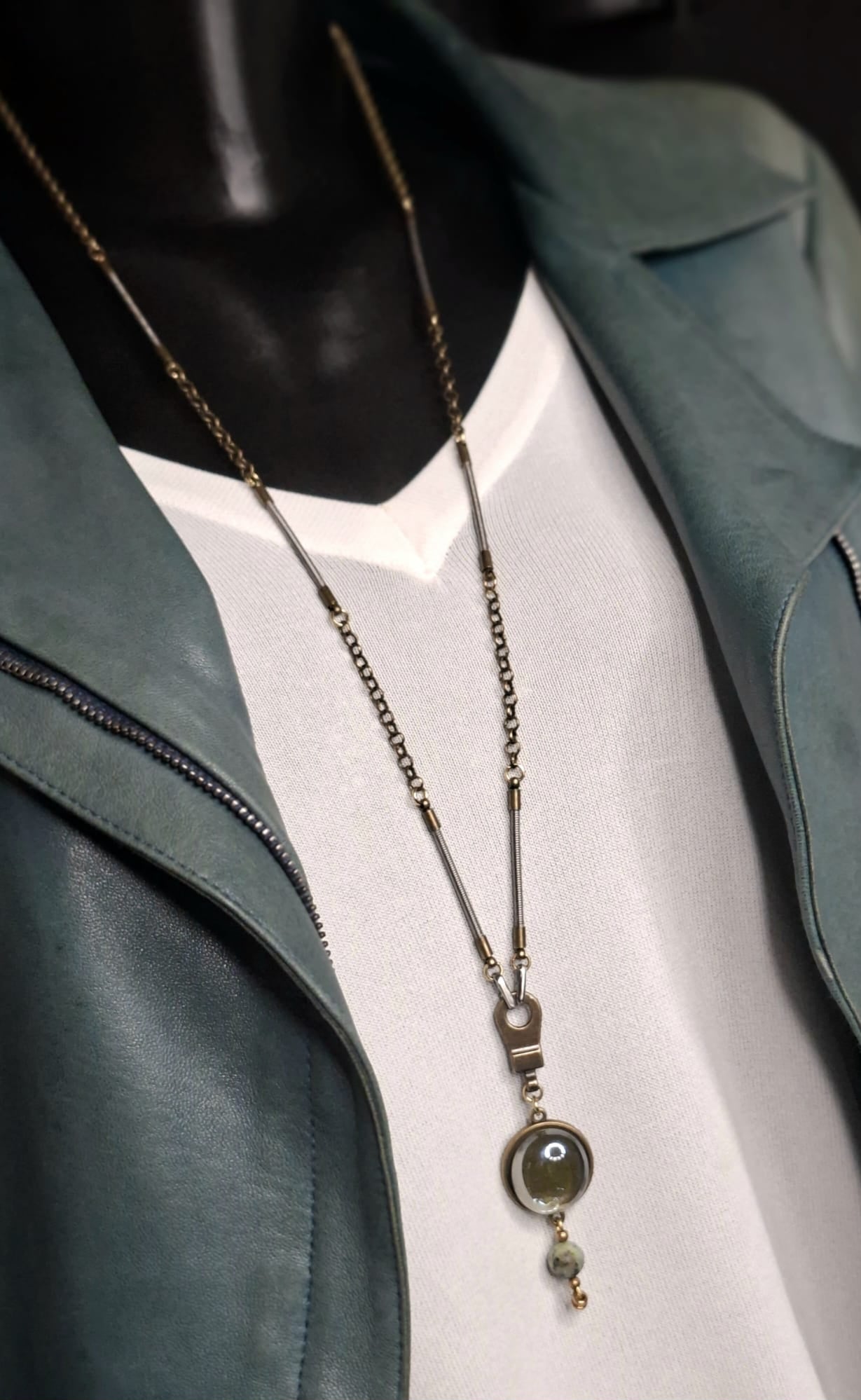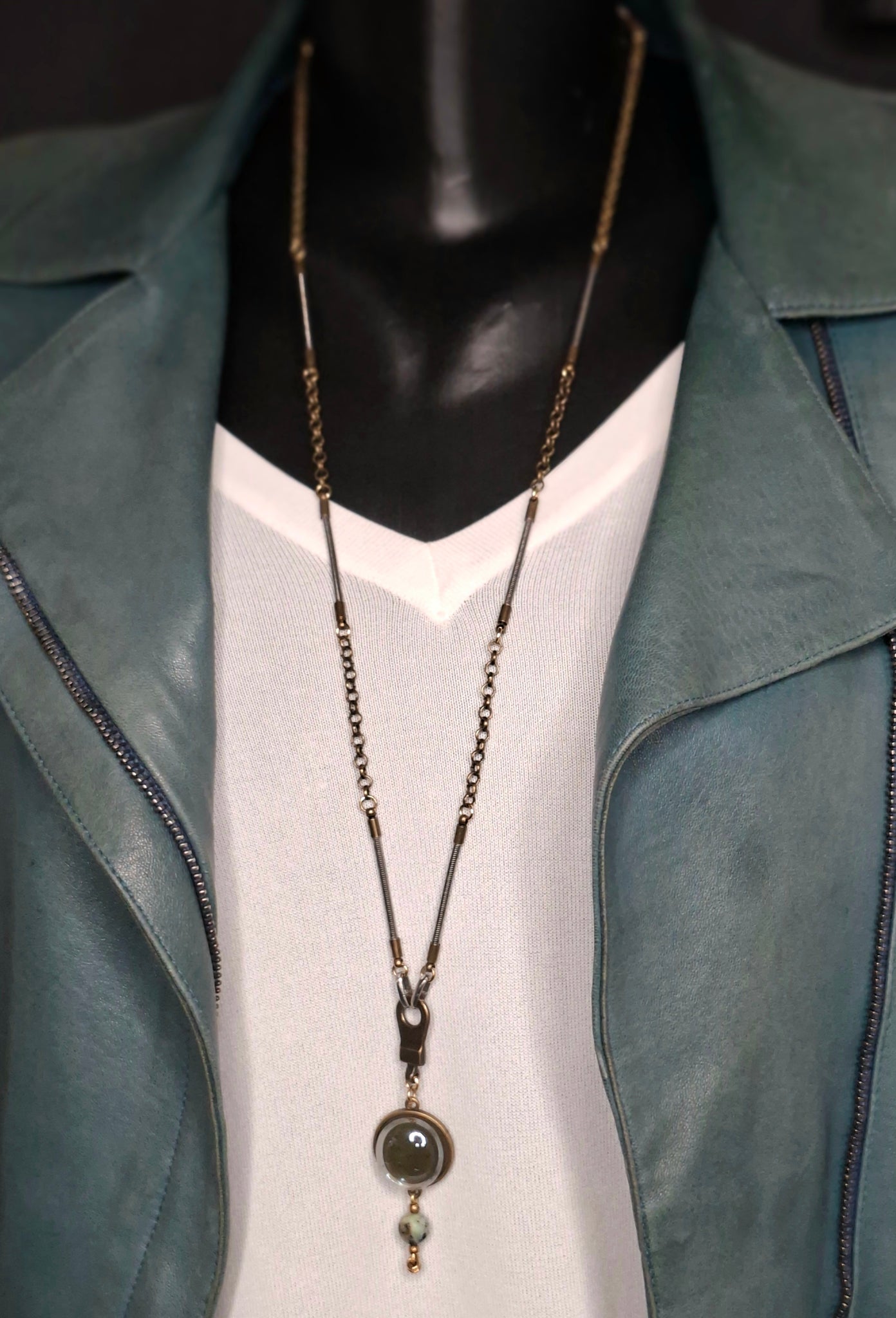 One-of-a-kind necklace – handcrafted from real bass guitar strings, bronze chain, and glass & African turquoise gemstone pendant. Can be worn long or doubled.